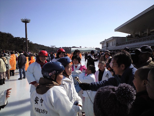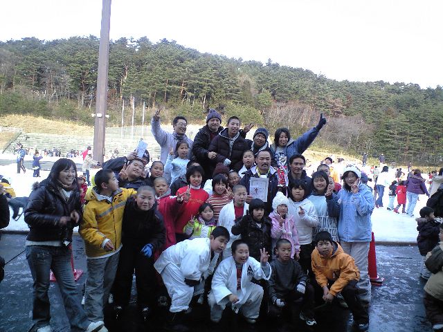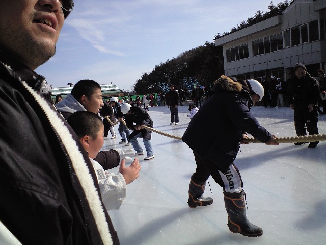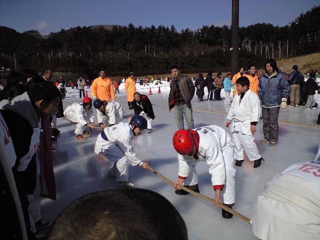 氷上綱引き大会に、おとなも子どもも大勢参加です。